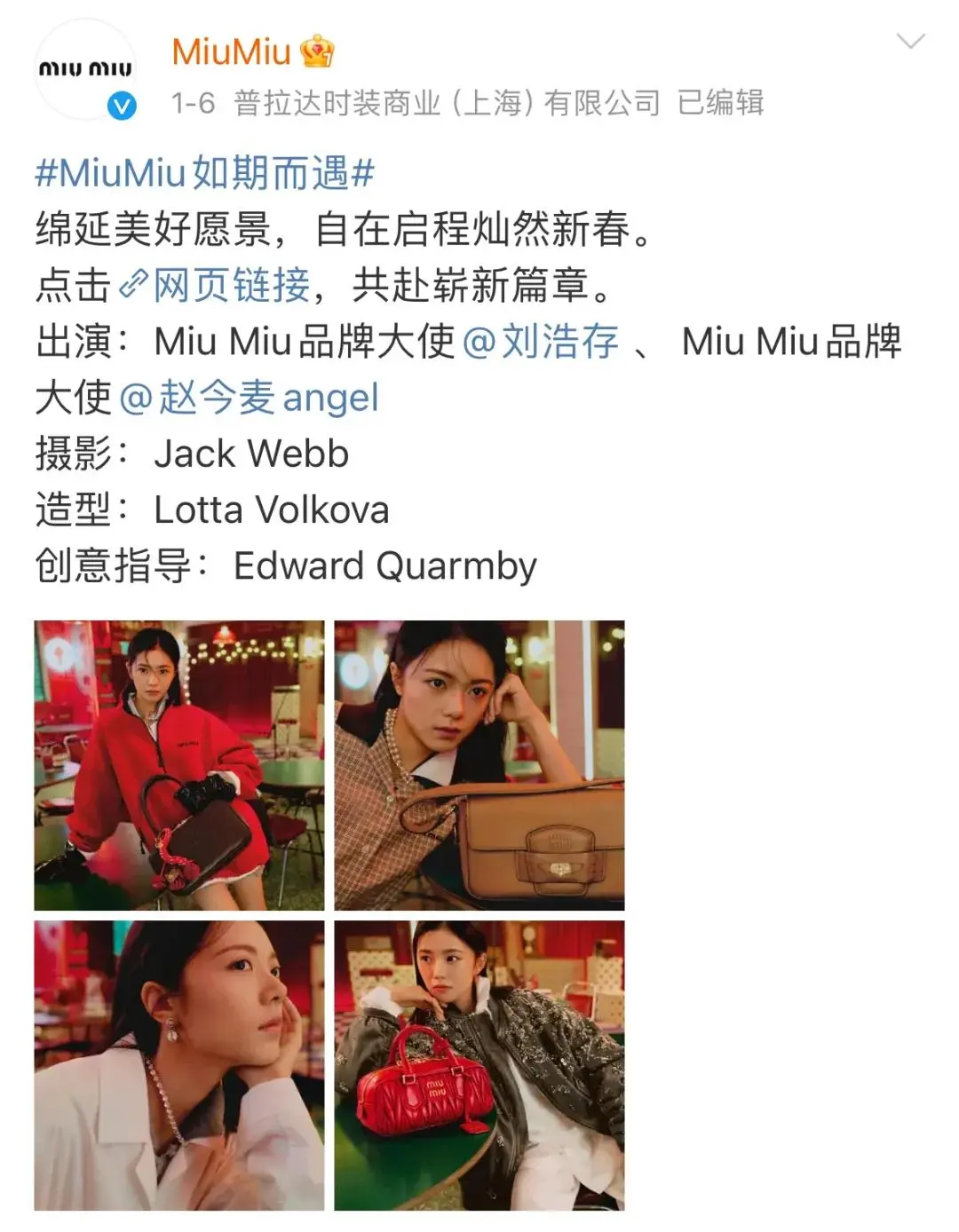 刘浩存和赵今麦则同为MiuMiu的品牌大使,